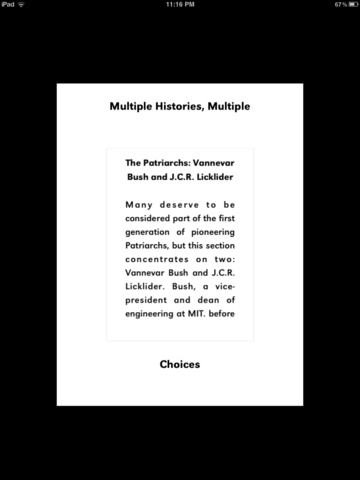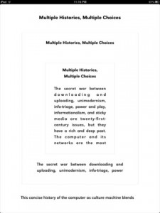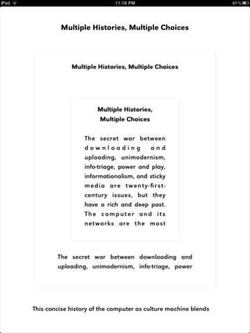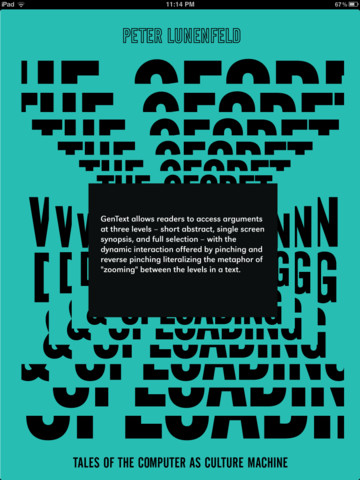 Gentext ap (interactive text application of book, The Secret War Between Downloading & Uploading by Peter Lunenfeld). Collaborators: Programmer, Chandler McWilliams with input from Peter Lunenfeld, writer, and Brian Roettinger, designer